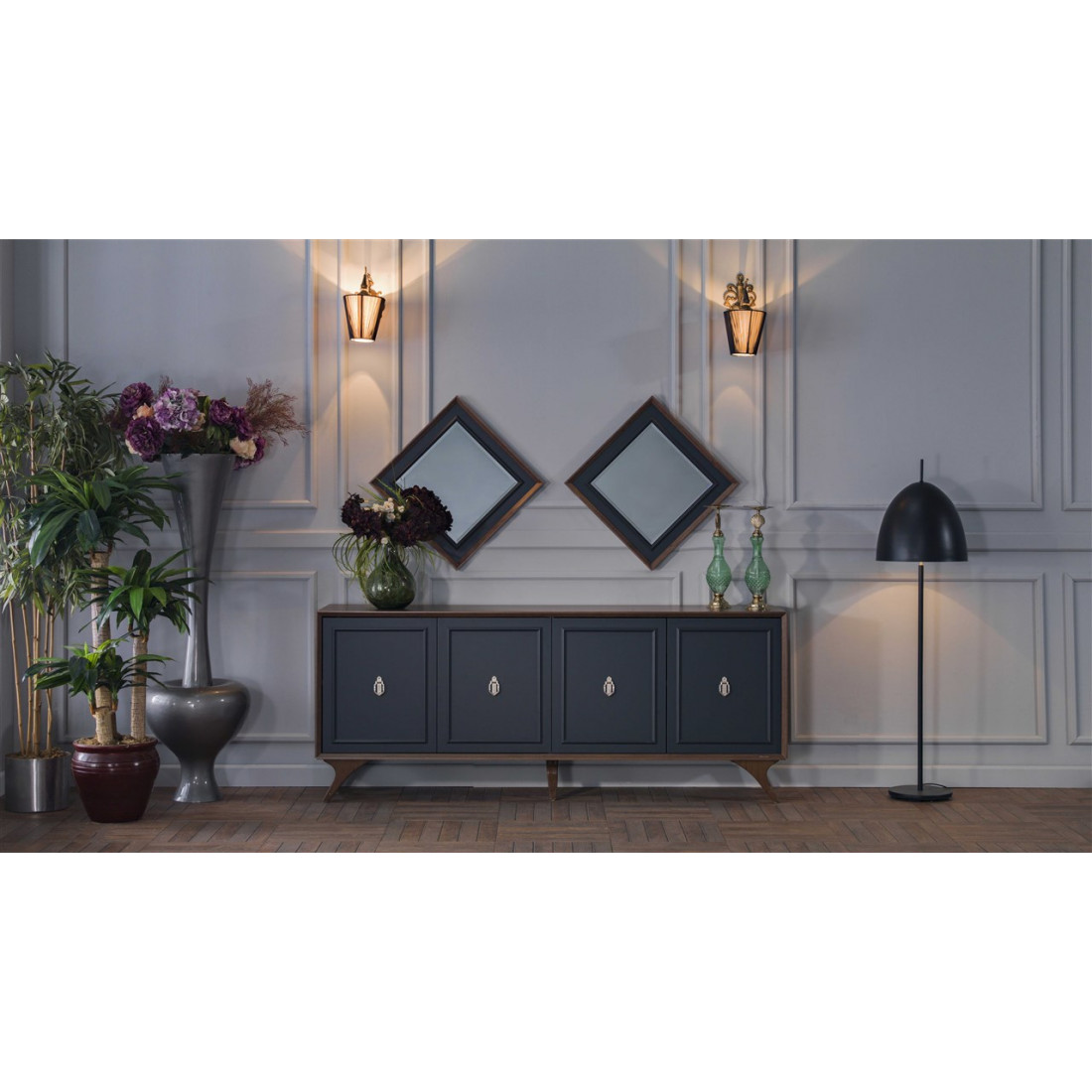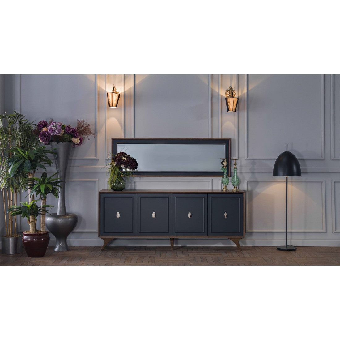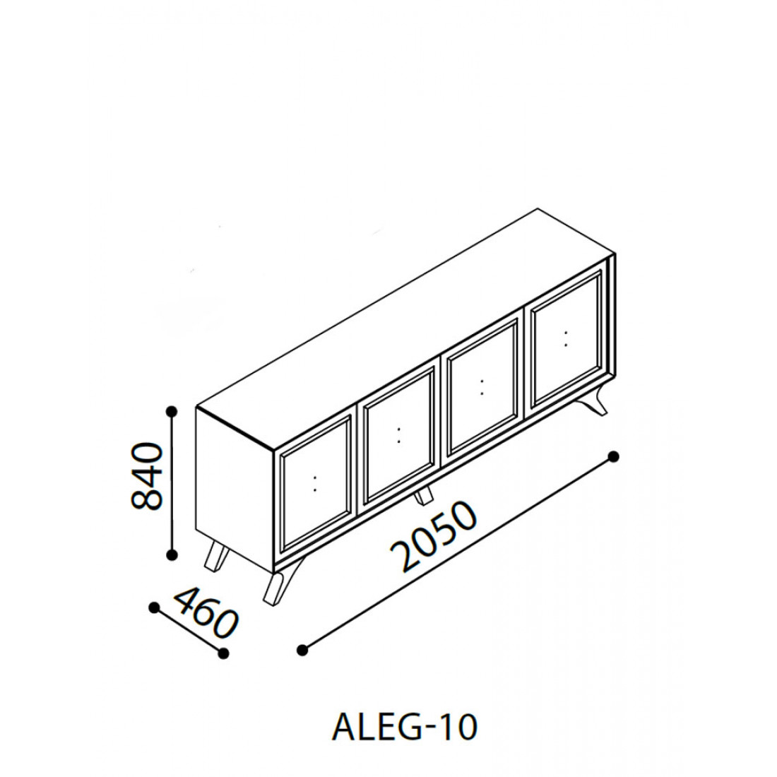 Длинный комод для посуды в гостиную ALEG-10 серии Алегро от Беллона средней высоты (840) станет прекрасным, многофункциональным дополнением интерьера гостиной и столовой. Ажурные ручки образуют единый декоративный элемент, сходясь в центре фасадов. В качестве материала для фасадов, столешницы и ножек использовался МДФ.