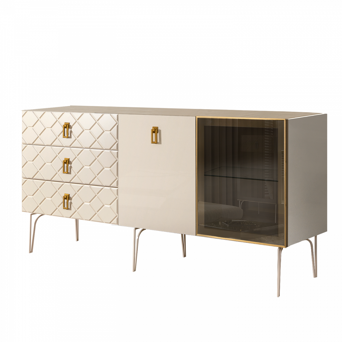 Стекло Stopsol меняет свои отражающие свойства под воздействием источников света. Поверхность, отражающая свет, мягко скроет содержимое вашего комода или витрины.