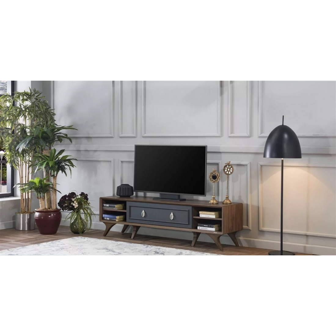 Тумба под ТВ в гостиную серии Алегро от Беллона станет прекрасным, многофункциональным дополнением интерьера гостиной. Ручки образуют единый декоративный элемент, сходясь в центре фасадов. В качестве материала для фасадов, столешницы и ножек использовался МДФ.